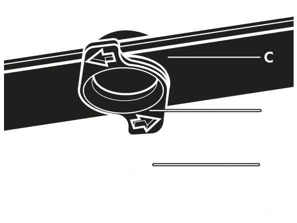 3. To reattach the spray arm (C), insert the mounting element (B) in the spray arm and fix it in the delivery tube (A) by turning it clockwise. Make sure that the mounting element locks into place.