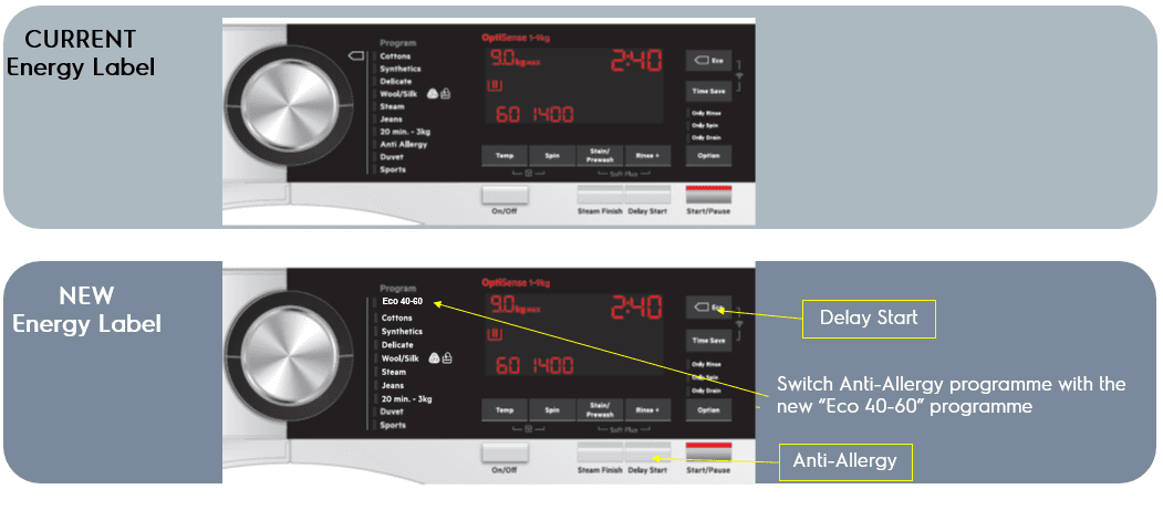 - The changes in the control panel are related to the addition of the mandatory eco 40-60 programme. To do this, we have had to move some programmes/ options around: the Anti-allergy programme has been moved to the Delay Start button which has been move to the Eco option button. In conclusion, you do not lose anything as we are replacing one eco programme by another one.