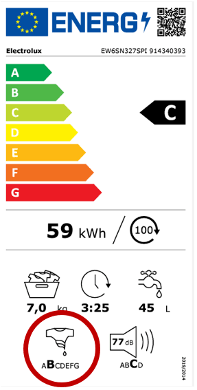 Spin classes are marked with letters from A (most efficient) to G (least efficient). Washing machines with spin class A leave less than 45% residual moisture in the laundry. This means that it takes less time to dry clothes, and if you use a dryer, it's also more economical.